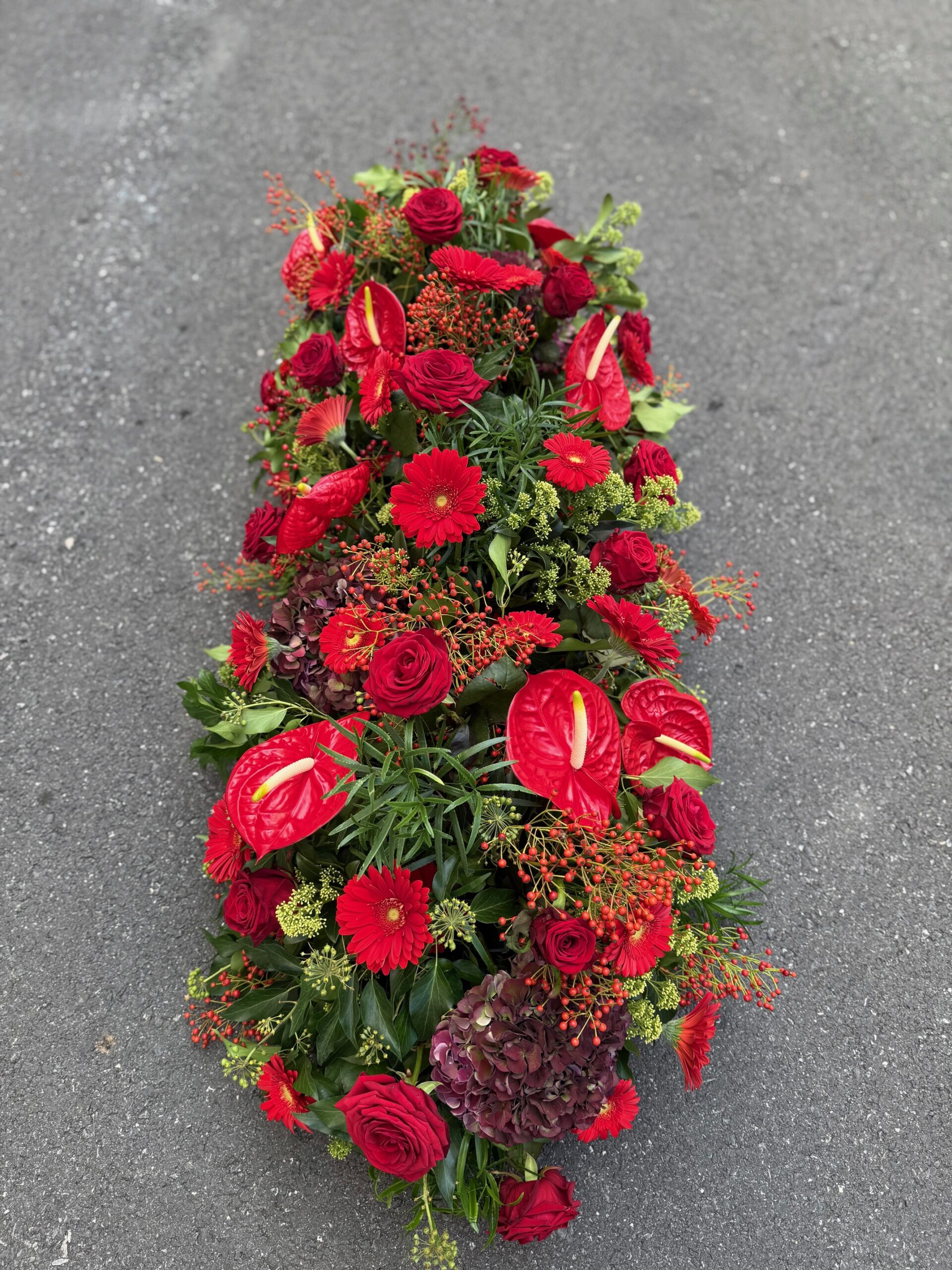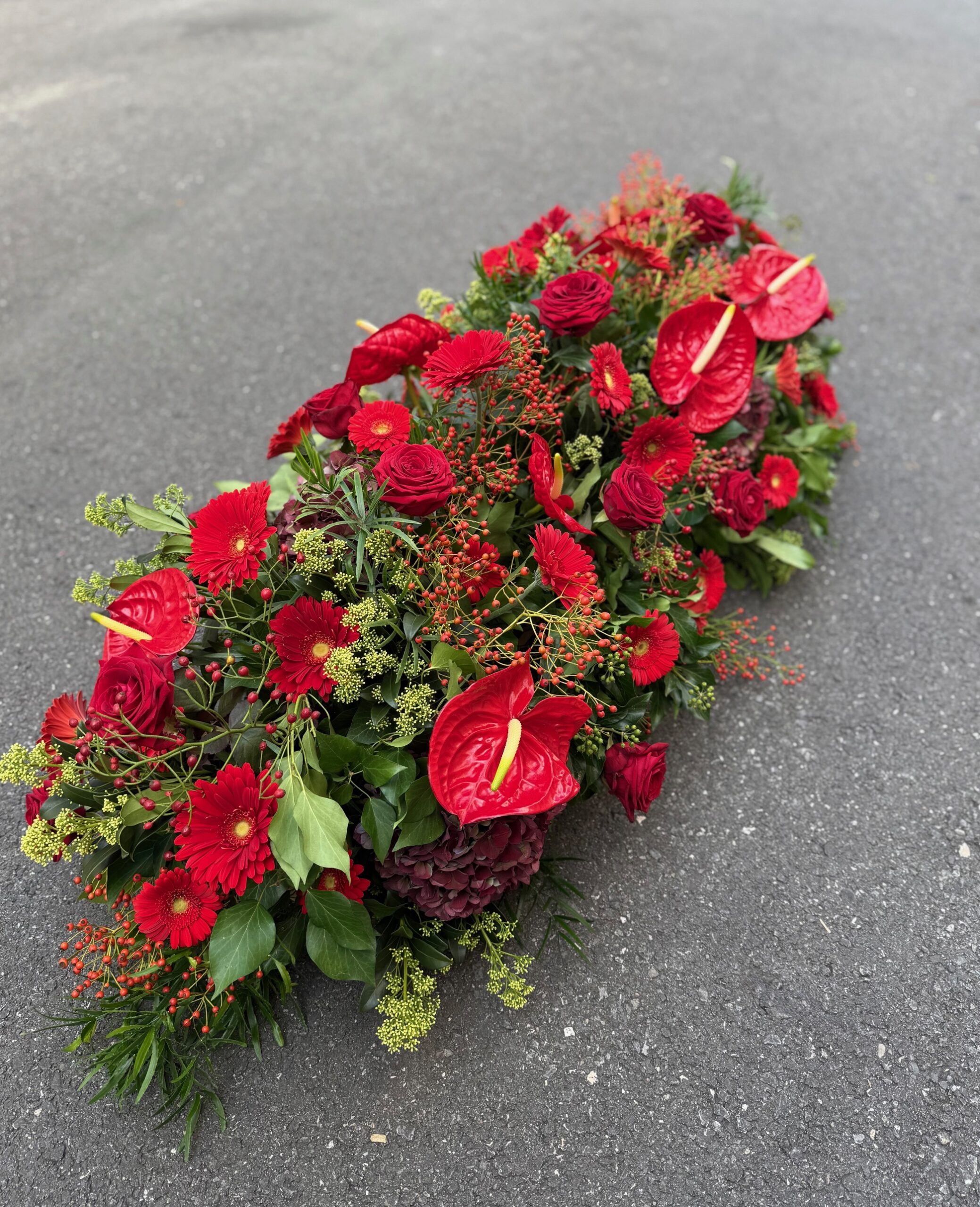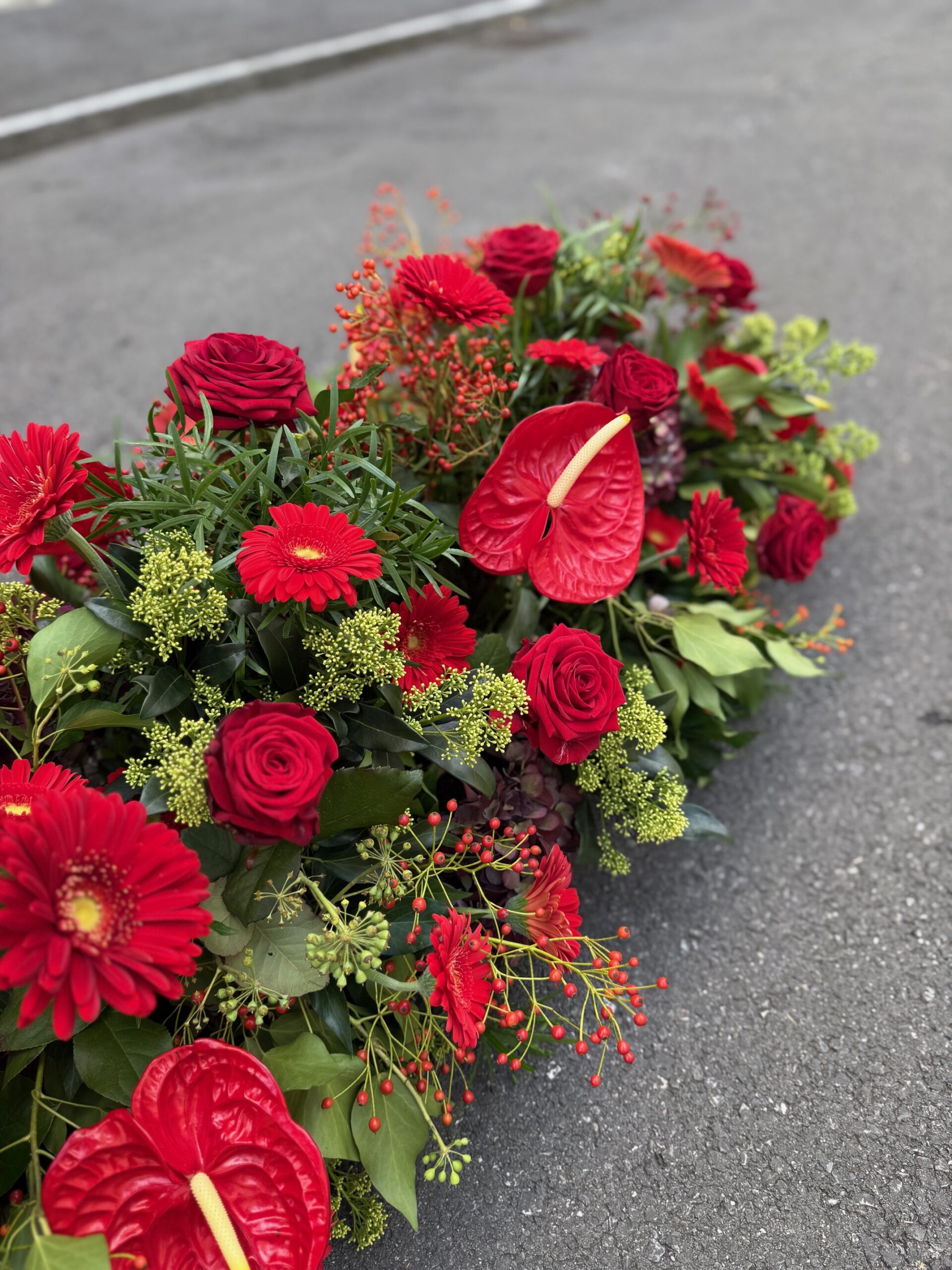 A vibrant, passionate tribute, this spray embodies the timeless power of love. Composed exclusively in shades of deep red, it elegantly brings together red roses, anthuriums and a refined selection of red flowers in a variety of textures. Each stem, each petal, each curve tells a story of indelible attachment.