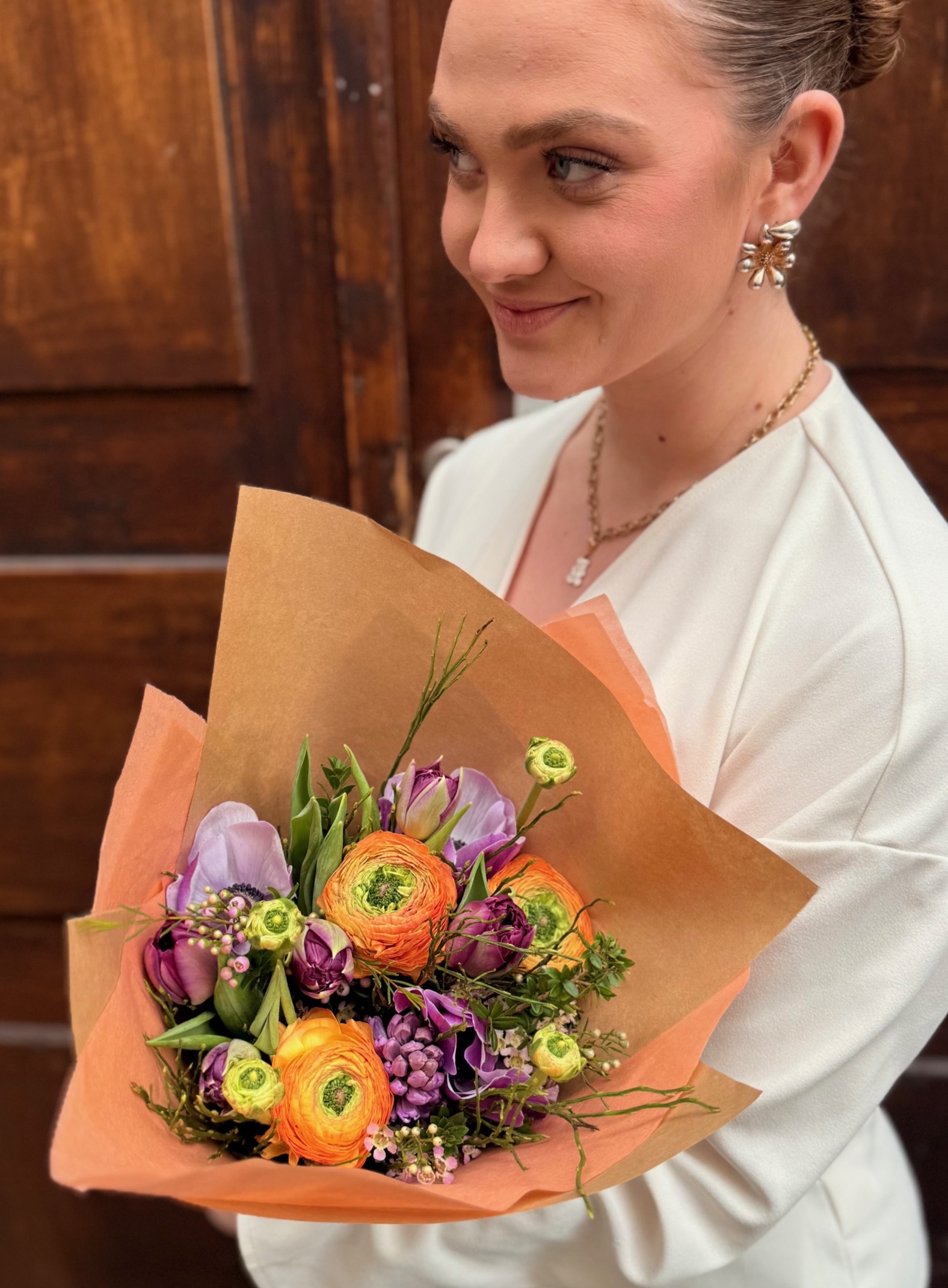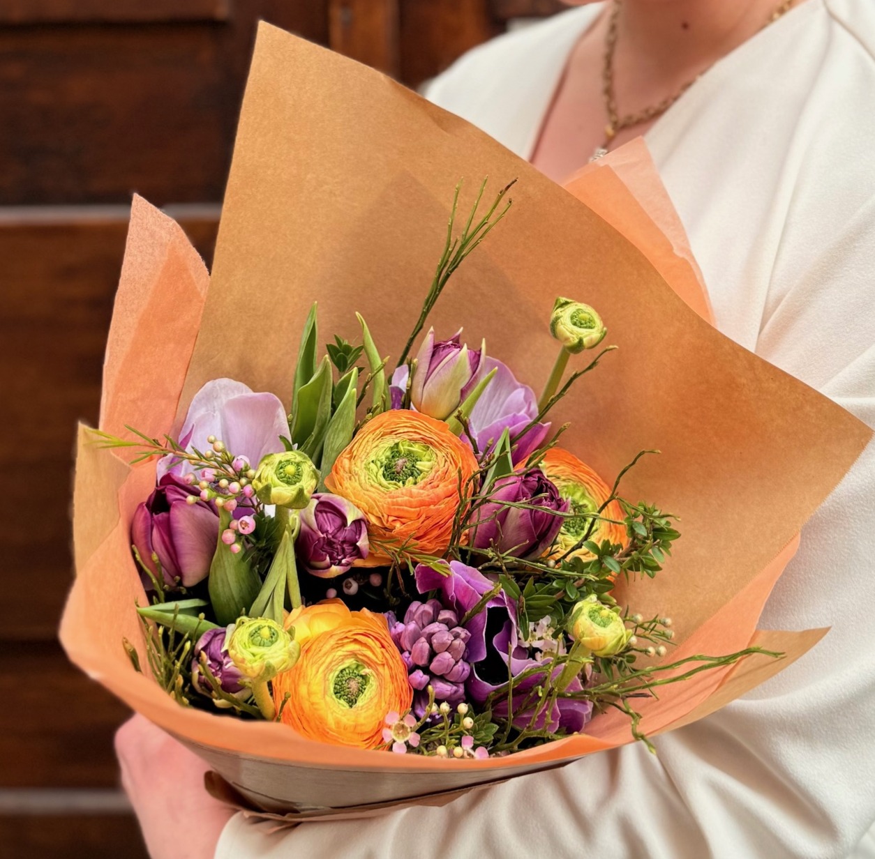 Vibrant et parfumé, ce bouquet de saison mêle des tulipes et des renoncules aux teintes orange et violet. La jacinthe y apporte son parfum délicat, tandis que la fleur de cire vient ajouter une touche de légèreté. Une composition lumineuse et pleine de caractère, parfaite pour faire entrer les couleurs et les senteurs de saison dans votre intérieur.Vous pourriez également aimer